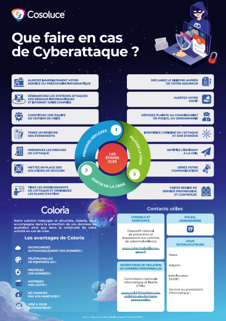 Dans cette affiche, nous avons regroupé pour vous les étapes clés pour gérer une cyberattaque.